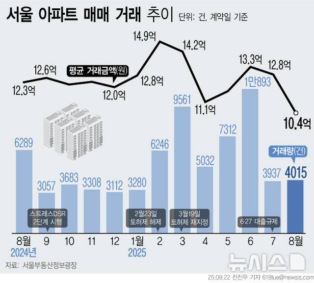 [서울=뉴시스] 22일 서울부동산정보광장에 따르면 8월 서울 아파트 매매 거래량은 4015건으로 한 달 전인 7월(3937건)을 넘어섰다. 대출 규제 발표 전인 6월 1만893건에서 3000건대로 곤두박질친 지 한달만에 거래량이 반등했다. (그래픽=전진우 기자)