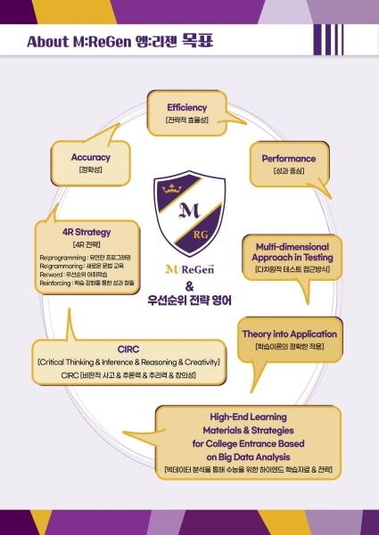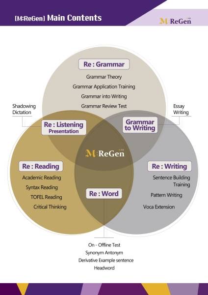 아울러, 리젠영어는 ▲Re:programming(학습 과정의 유연한 프로그래밍) ▲Re:grammaring(새로운 관점의 문법 교육) ▲Re:word(우선순위 기반 어휘 학습) ▲Re:inforcing(반복과 강화를 통한 성과 창출)이라는 독창적인 4R 전략을 운영 중이다.