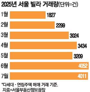 22일 서울부동산정보광장에 따르면 지난 6월과 7월 서울시 월별 빌라(다세대·연립주택) 매매 거래량은 각각 4052건과 4011건을 기록하며 두 달 연속 4000건을 돌파했다. 이는 2022년 5월(4472건) 이후 3년2개월 만에 월 단위 최다 거래량이었다. 지난해 하반기 평균 2739건에 머물렀던 서울 빌라 거래량은 올해 1월 1827건까지 떨어진 후 반등하는 중이다.