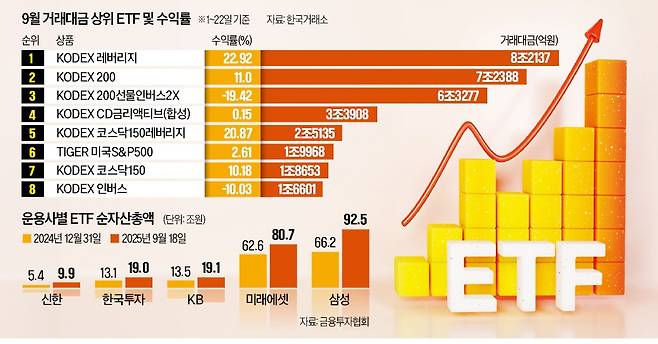 코스피지수의 가파른 상승세 속에 레버리지와 곱버스를 활용한 ‘전투 개미’들이 ETF 시장을 주도하고 있다는 평가가 나온다. 9월 들어 두 종목의 거래대금 합계는 15조원에 달한다. 특히 KODEX 레버리지는 6월부터 3개월 연속 거래대금 10조원을 돌파했다. 이번 달에도 10조원을 넘길 것이 확실시된다. 코로나19 유동성 장세로 월평균 거래대금이 20조원에 달했던 2020년에는 미치지 못하지만, 이 종목의 월 거래대금이 10조원을 넘은 것은 2022년 6월 후 3년 만이다.