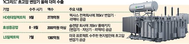 앞서 효성중공업도 미국 최대 송전망 운영사와 765㎸ 초고압 변압기·리액터 29대, 800㎸ 초고압 차단기 24대 등 총 2000억원 이상 규모 전력기기를 '풀패키지'로 공급하는 계약을 체결했다. 한국 기업이 765㎸ 송전망에 전력기기를 패키지 형태로 일괄 공급한 건 이번이 처음이다.
