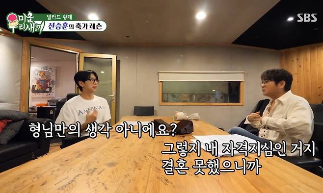 또 그는 결혼식장에서의 '웃픈' 에피소드도 전했다. 신승훈은 "포토월 앞에 서면 꼭 '노총각 신승훈 부러워 죽겠어요' 같은 사진 기사가 난다"며 "그 뒤로는 직원들 다니는 길로 숨어서 들어갔다. 요즘은 결혼식장 자체를 잘 가지 않는다"고 설명했다.