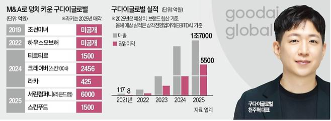 2016년 서울 구로디지털단지 인근 작은 사무실에서 첫발을 뗀 구다이글로벌은 조선미녀를 시작으로 K뷰티 브랜드를 잇달아 인수하면서 덩치를 키웠다. 최근 2년간 티르티르, 스킨1004(크레이버), 라운드랩(서린컴퍼니), 스킨푸드 등을 줄줄이 사들이며 조 단위 매출을 거두고 있다. 전체 매출의 80% 이상이 미국 유럽 등 글로벌 시장에서 나온다.