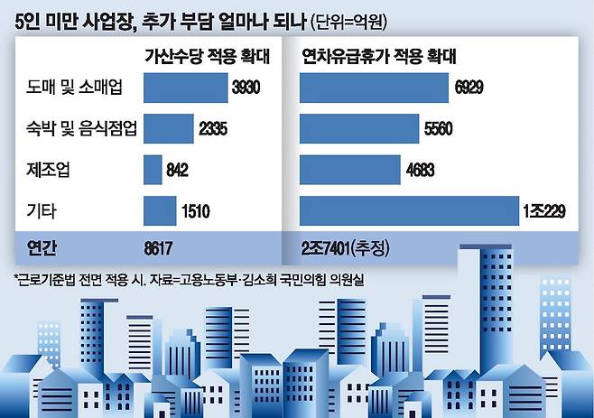 자영업자들의 호소는 통계에서도 확인된다. 가산수당 확대에 따른 추가 임금 비용은 도소매업 3930억원, 숙박·음식점업 2335억원, 제조업 842억원으로 추산됐다.
