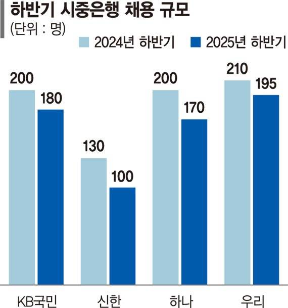 22일 금융권에 따르면 KB국민은행·신한은행·하나은행·우리은행 등 4대 시중은행의 올해 하반기 채용 규모는 총 645명에 그친다. 지난해 하반기(740명)와 비교하면 100명 가까이 감소한 수치다. 연간 기준으로도 2023년 1880명, 지난해 1270명에서 올해는 1215명으로 감소세다.