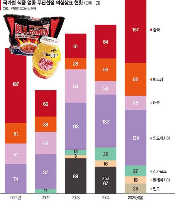 실제로 중국의 식품업종 상표권 무단선점 의심상표 건수는 지난해 84건이었지만 올해는 8월 현재 157건으로 2배가량 늘었다. 베트남도 지난해 56건에서 올해 82건, 태국은 34건에서 35건, 인도네시아도 132건에서 139건으로 늘었다. 12월까지 이 수치는 더 증가할 전망이다