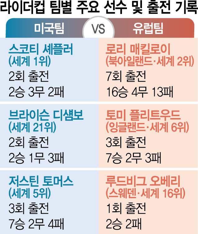 2연패이자 2004년과 2012년 이후 세 번째 원정 승리에 도전하는 유럽은 여덟 번째 라이더컵을 치르게 된 매킬로이(2위)를 앞세운다. 올 시즌 PGA 투어 최종전 투어 챔피언십 우승자 토미 플리트우드(잉글랜드·6위), 2월 제네시스 인비테이셔널 우승자 루드비그 오베리(스웨덴·16위) 등이 뒤를 받친다.