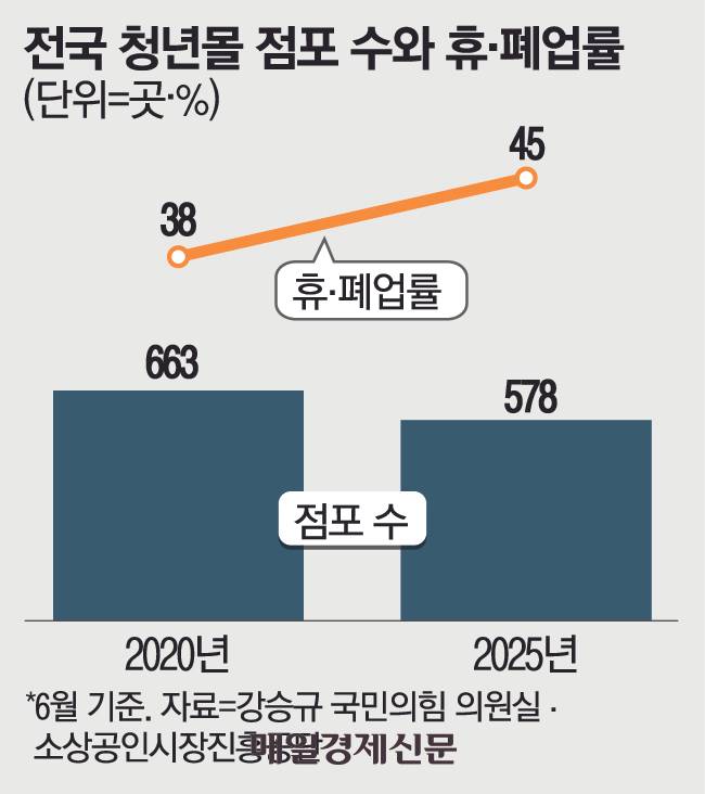 올해 6월 기준 전국 청년몰에는 578곳의 점포가 있었지만, 이들 중 휴·폐업 점포는 260곳으로 휴·폐업률이 45%에 달했다. 청년몰 점포 수가 가장 많았던 2020년에는 663곳 점포 중 휴·폐업 점포가 253곳으로 38%였던 점을 감안하면 ‘부진의 늪’에 빠져 있다.