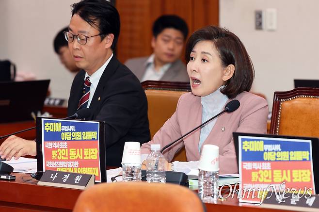 | ▲ 나경원 국민의힘 의원이 22일 국회 법제사법위원회 전체회의에서 열린 검찰개혁 입법청문회에서 더불어민주당 의원들과 설전을 벌이고 있다. |