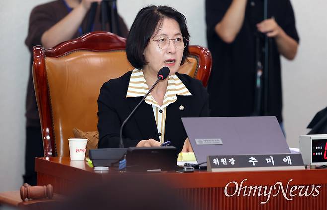 | ▲ 추미애 국회 법제사법위원장이 22일 국회 법제사법위원회 전체회의에서 열린 검찰개혁 입법청문회에서 발언하고 있다. |