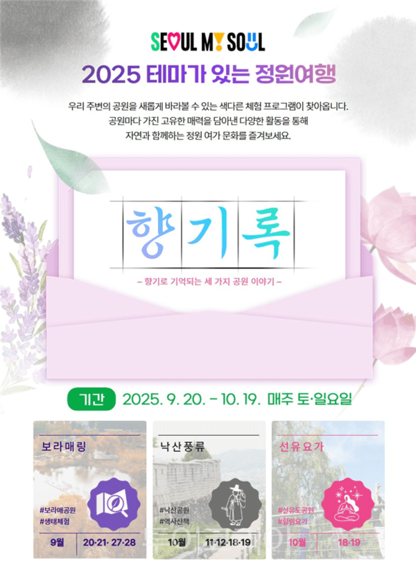 서울시는 보라매공원, 낙산공원, 선유도공원의 고유한 매력을 담은 향기와 함께 오감으로 공원을 체험할 수 있는 '테마가 있는 정원여행'을 이달 27일부터 10월 19일까지 선보이고 내일(23일)부터 참여자를 모집한다.