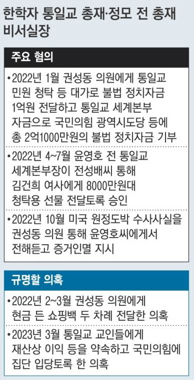 한 총재는 2022년 1월5일 권성동 국민의힘 의원에게 통일교 민원과 윤석열 정부의 통일교 지원을 청탁하며 불법 정치자금 1억원을 전달하고, 통일교 자금으로 국민의힘 광역시도당 등에 총 2억1000만원의 불법 정치자금을 기부한 혐의(정치자금법 위반)를 받는다. 2022년 4~7월 통일교의 각종 민원 해결을 위해 통일교 전 세계본부장 윤영호씨가 건진법사 전성배씨를 통해 김건희 여사에게 ‘8000만원대 청탁용 선물’을 전달하도록 한 혐의(청탁금지법 위반), 이 금품을 마련하기 위해 통일교 자금을 활용한 혐의(업무상 횡령)도 받는다. 2022년 10월 권 의원이 윤씨에게 전한 통일교 임원 등의 미국 원정도박 수사 정보를 듣고 증거인멸을 지시한 혐의(증거인멸교사)도 있다. 정씨는 한 총재와 공범 관계로 4가지 혐의를 똑같이 받는다.