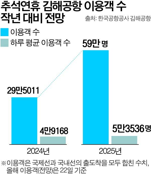 특히 올 한 해 누적 이용객 1000만 명 돌파가 예상되는 김해공항의 경우 국내·국제선에는 이 기간 총 59만 명이 다녀갈 것으로 공사는 예상한다. 하루 평균 이용객은 5만3536만 명이다. 지난해 추석연휴 특별교통대책 기간(9월 13~18일) 하루 평균 이용객(4만9168명)보다 8.8% 증가한 수치로, 연휴가 길어지면서 이용객은 더 늘어날 것으로 보인다.