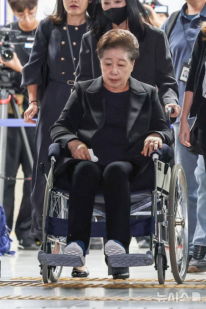 [서울=뉴시스] 황준선 기자 = 청탁금지법과 정치자금법 위반 등 혐의를 받는 한학자 통일교 총재가 22일 오후 서울 서초구 서울중앙지방법원에서 열린 영장실질심사(구속 전 피의자 심문)을 마친 뒤 법정을 나서고 있다. (공동취재) 2025.09.22. photo@newsis.com
