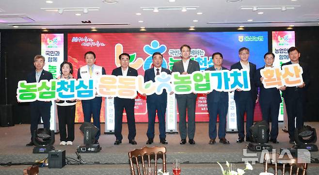 [울산=뉴시스] 배병수 기자 = 농협중앙회 울산본부가 주관한 사랑의 울산쌀 전달 및 농심천심(農心天心) 운동 비전 선포식이 22일 울산시티컨벤션 안다미로홀에서 열린 가운데 김두겸 (왼쪽 다섯번째)울산시장과 이성룡 울산시의회 의장 등 참석자들이 기념촬영을 하고 있다.(사진=울산시 제공).2025.09.22.photo@newsis.com.