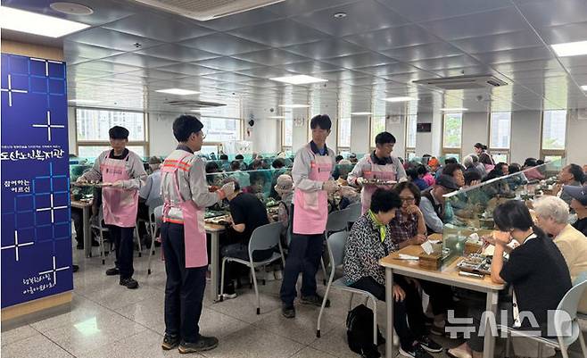 [울산=뉴시스] 배병수 기자 = 롯데이네오스화학은 22일 울산 남구 도산노인복지관을 방문해 추석 명절 맞이 배식 봉사활동을 하고 있다. 복지관 내 경로식당을 이용하는 300명의 어르신을 위해 롯데이네오스화학 임직원과 자원봉사자가 함께 배식 봉사활동을 진행하고, 컵과일 간식을 나눠드리며 따뜻한 온기를 전하고 있다.(사진=롯데이오네스화학 제공).2025.09.22.photo@newsis.com.