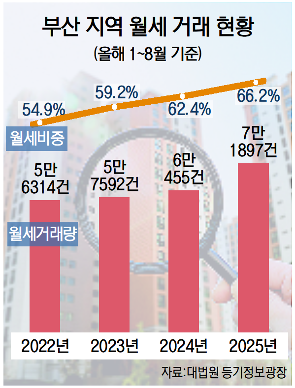 부산 월세 건수는 전세보다 2배 가까이 된다. 1~8월 부산에서 확정일자를 받은 전세 계약은 3만 6548건에 그쳤다. 특히 전체 임대차 계약 중 부산의 월세 비중은 66.2%로, 월세가 ‘뉴노멀’로 자리 잡았다는 서울(64.3%)보다 높다. 2022년 부산의 전세 거래 비중이 54.9%에 불과했으니, 3년 새 11.3%포인트(P)나 올랐다.