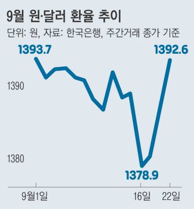 시장 예상대로 연준이 지난 17일(현지시간) 기준금리를 0.25%포인트 인하했지만 원·달러 환율은 되레 오름세를 보이면서 이날까지 2거래일 연속 1390원대를 기록했다.