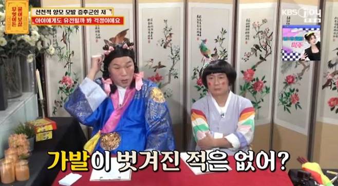 만 5살부터 가발을 썼다는 의뢰인은 “어릴 때부터 많이 힘들었을 것 같다”는 말에 “예전에는 고정되는 가발이 없어서 가발이 벗겨진 적도 많다. 초등학교 3학년 때 남자인 친구가 모르고 잡아당겨서 전교생 앞에서 가발이 벗겨진 적도 있었다. 저는 울면서 바로 집으로 뛰어갔다. 그러면 저희 엄마는 제가 숨을까봐 다시 저를 데려다 학교에 앉혀 놨다. 그러면서 저한테 ‘눈이 나쁘면 안경 쓰는 것처럼 가발을 쓰는 거다’라고 말해주셨다. 엄마 덕분에 밝게 자랄 수 있었던 것 같다”라고 돌아봤다.