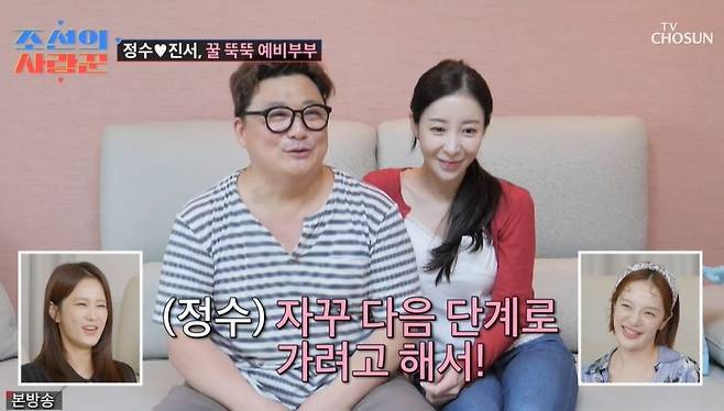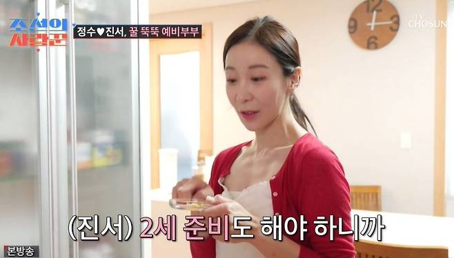 원진서는 윤정수의 영양제를 챙겼고, "2세 준비해야 하니까"라고 밝혔다. 영양제를 먹은 후에도 두 사람은 뽀뽀했고, 최성국은 "너무 하잖아요"라고 불만을 토로했다. 윤정수는 "부럽죠?"라며 자랑하기도.