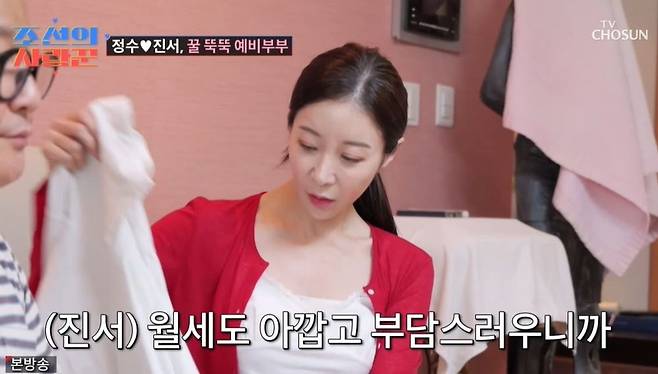 원진서는 50평대 집에 대해 "집이 너무 넓다. 월세도 아까운데, 좀 줄여서 전세로 가야 하지 않을까?"라고 제안했다. 이를 들은 윤정수는 "그렇게 하는 걸 목표로 하고"라고 말했지만, "넓은 집에 살면 아이디어가 잘 나오더라"면서 달갑지 않아 했다. 그러나 원진서는 "이사 가서 제일 넓은 방을 써라"라고 단호하게 말했다.