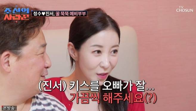한 번에 뽀뽀를 여러 번 할 때도 있단 말에 제작진이 "차라리 키스하지"라고 하자 원진서는 "오빠가 키스를 가끔 해주세요"라고 솔직히 말했다. 원진서가 "처음엔 잘해줬는데"라고 하자 당황한 윤정수는 "키스하면 자꾸 다음 단계로 가려고 해서 부담스럽다"라고 고백했다. 원진서가 뒤에서 찌르자 윤정수는 "농담이다"라고 말하기도.