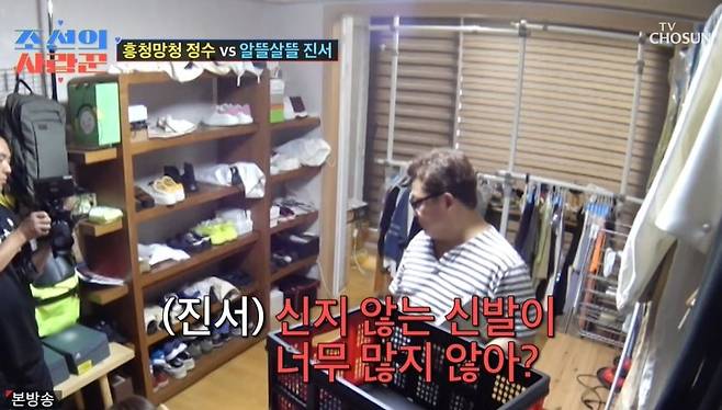 또한 원진서는 "집도 좀 정리해야 하지 않냐"라고 말했다. 인터뷰에서 원진서는 "오빠가 돈을 버는 만큼 많이 쓰는 것 같더라. 애착이 많아서 버리질 못한다. 비울 거만 비우면 집이 깔끔해지지 않을까"라고 밝혔다. 쌓여있는 신발만 약 50켤레인 상황. 원진서는 "신는 걸 못 봤는데"라고 지적했다.