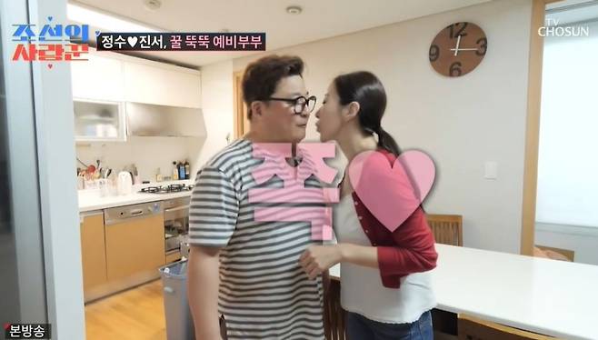 윤정수는 평소에도 뽀뽀를 자주 한다고 말하며 "내가 이 사람한테 사랑받는단 안정감을 느끼게 해준다"라며 "하루에 50번은 넘게 하는 것 같다"라고 밝혔다. 원진서는 "주말엔 그렇고, 평일엔 10번~20번 한다. 일하러 가니까"라고 진지하게 답하기도.