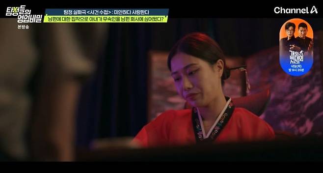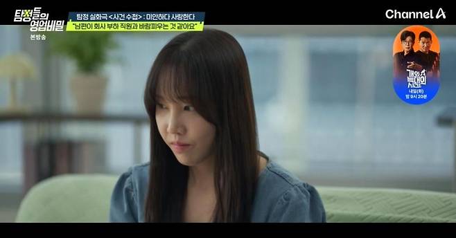 22일 방송된 채널A '탐정들의 영업비밀' 속 '사건 수첩'에서는 "남편이 회사 부하 직원과 바람을 피우는 것 같다"는 여성 의뢰인의 사연이 그려졌다.