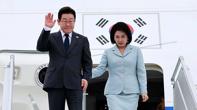 ▲ 유엔총회 참석차 미국을 방문한 이재명 대통령과 김혜경 여사가 22일(현지시간) 뉴욕 JFK공항에 착륙한 공군 1호기에서 환영객에게 인사하고 있다.