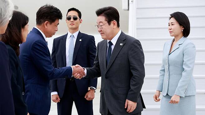 ▲ 유엔총회 참석차 미국을 방문한 이재명 대통령이 22일(현지시간) 뉴욕 JFK공항에서 환영 나온 차지훈 주유엔대사와 악수하고 있다.