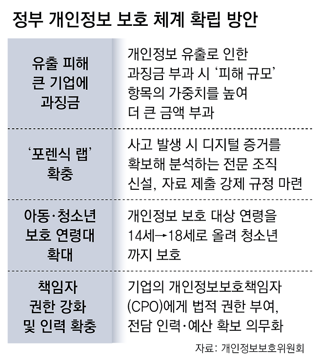 개인정보 유출 사고가 발생하면 디지털 증거를 확보하고 분석할 ‘포렌식 랩’을 신설하고, 기업이 자료 제출을 거부하지 못하도록 강제할 수 있는 권한을 마련해 사고 원인과 피해 규모를 빨리 확인할 수 있는 시스템을 갖추기로 했다. 피해가 큰 경우에는 전체 이용자에게 즉시 유출 사실을 알리도록 해 2차 피해를 막을 계획이다.