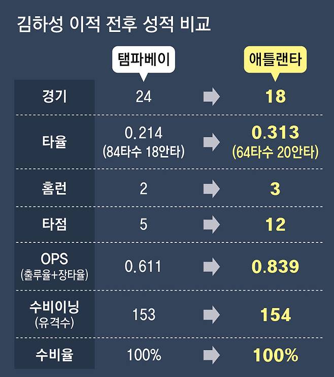 김하성이 애틀랜타 데뷔전을 치른 3일 시카고 컵스전부터 이날까지 애틀랜타는 방문경기에서 한 번도 패하지 않고 8연승을 달렸다. 애틀랜타는 이미 포스트시즌 탈락이 확정된 상태지만 김하성 덕에 시즌 막판 분위기 반전에 성공하면서 내년 시즌을 기대할 수 있는 이유를 찾았다.