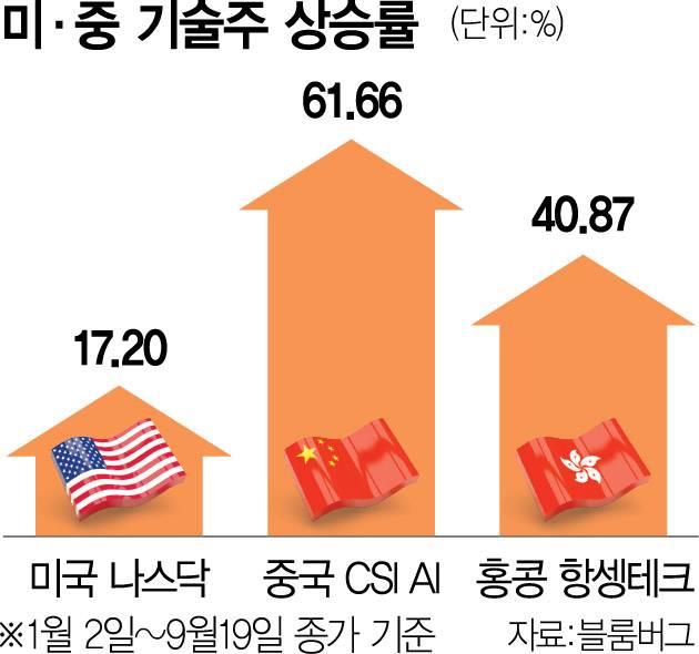 21일(현지 시간) 파이낸셜타임스(FT)에 따르면 중국 상하이증권거래소 상장 AI 테마주들로 구성된 ‘CSI AI’지수는 올 들어 이달 19일까지 61.66% 오르며 같은 기간 나스닥지수(17.20%) 수익률을 세 배 이상 넘어섰습니다. 알리바바·텐센트 등 중국 빅테크로 구성된 홍콩 항셍테크지수 역시 같은 기간 40.87% 급등했습니다.
