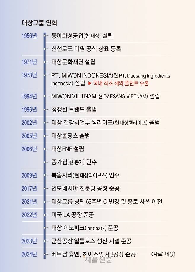 고 임대홍 대상그룹 창업주는 전북 정읍 출신이다. 임 창업주는 이리농림학교를 졸업한 뒤 고창군청 공무원으로 일했으나 해방 이후 공직을 떠나 피혁공장을 세웠다. 6·25 전쟁 직후 복구사업이 시작되면서 무역업에 뛰어들었고, 일본을 오가며 국내 식탁을 장악한 조미료 ‘아지노모토’를 보고 국산 조미료 개발을 결심했다.