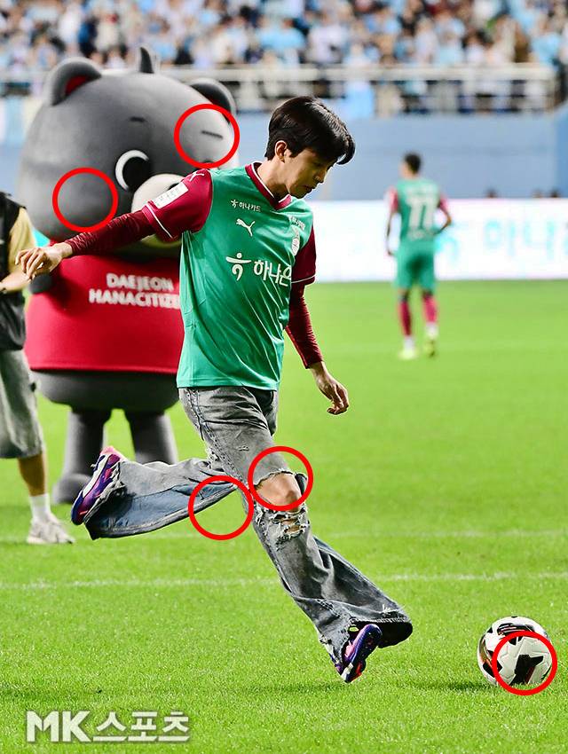 이날 시축 행사에서 임영웅은 찢청 패션에 축구화를 신고 그라운드에 들어섰습니다.
