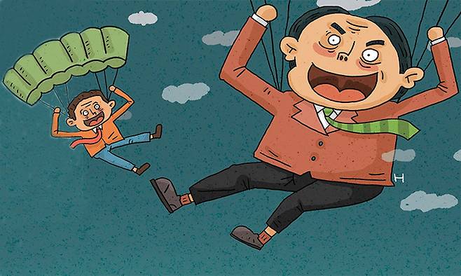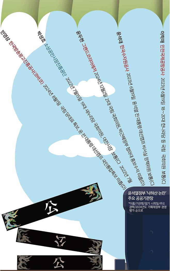 윤석열정부에서 임명돼 낙하산 논란을 빚은 공공기관장들에 대한 내외부 평가는 대체로 부정적이다. 주요 공기업과 준정부기관, 기타공공기관 곳곳에 포진된 이들의 이력을 살펴보면 관련 경력이나 전문성을 찾기 어렵다. 전 정권 창출에 공헌했거나 총선에서 낙선·낙천한 여당 출신이라는 공통점만 있다. 권력을 잡았던 측에서 ‘하사품’처럼 내려보낸 낙하산인 셈이다.
