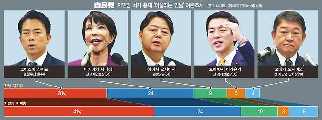 고이즈미 농림상의 아버지는 2000년대 초반 일본 정부를 이끌던 고이즈미 준이치로 전 총리다. 아버지 후광을 입고 28살 때 초선 국회의원, 38살 때 첫 입각을 한 ‘금수저 정치인’이다. 지난 20일 출마 선언을 하면서 ‘국민 1인당 한해 평균 임금 100만엔(약 946만원) 인상’을 공약으로 내걸었다. 1990년대 500만명이던 당원이 5분의 1 수준으로 줄어든 망가진 당을 재건하겠다는 다짐도 했다. 설익은 말이 앞서는 이른바 ‘고이즈미 스타일’이 표를 갉아먹는다는 평가를 받아왔다. 지난해 총재 선거 때도 선두를 달리다가 후보 토론회에서 “노동시장 개혁을 위해 해고 규제를 재검토하겠다”는 등 발언 등으로 비판을 받고 최종 성적 3위로 마무리했다. 요미우리신문은 “고이즈미 농림상이 지난 총재 선거 때 파문을 불렀던 노동시장 개혁 등은 언급하지 않고 철저히 ‘안전 운행’에 돌입했다”고 풀이했다. 하지만 ‘이미지’로 얻은 점수를 ‘말’로 잃는다는 우려는 여전하다.