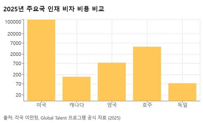 영국은 2020년부터 ‘글로벌 인재 비자’ 제도를 도입해 운영 중이다. 과학·공학·인문학·의학·디지털·예술 분야 전문가가 대상이다. 비자 취득 시 5년간 체류할 수 있으며 연장도 가능하다. 일정 조건 충족 시 영주권도 신청할 수 있다. 하지만 이 비자는 취득이 힘들고 비용이 높다는 지적을 받아 왔다. 글로벌 인재 비자 신청비는 766파운드다. 가족 동반 시 배우자와 자녀도 동일한 수수료를 내야 한다. 여기에 통상 1인당 연간 1035파운드의 건강 부담금까지 부과된다. 영국 정부 관계자는 FT에 현 글로벌 인재 비자 제도를 “관료적 악몽”이라고 평가했다. 이 관계자는 “비자 절차를 더 원활히 진행할 수 있도록 돕는 방안도 마련하고 있다”고 말했다.