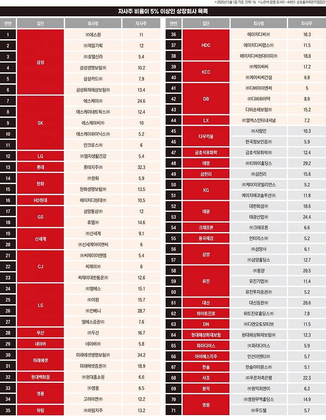 공정거래위원회도 압박 수위를 높였다. 9월 10일 공정위는 올해 지정된 92개 공시대상기업집단의 주식 소유 현황을 공개하며 5월 1일 기준 자사주 비율이 5% 이상인 상장사를 낱낱이 지목했다. 전체 40개 집단 71개사가 목록에 올랐다. 미래에셋생명(34.2%), 롯데지주(32.3%), 티와이홀딩스(29.2%), 인베니(28.7%), SK㈜(24.6%) 등이 대표적이다.