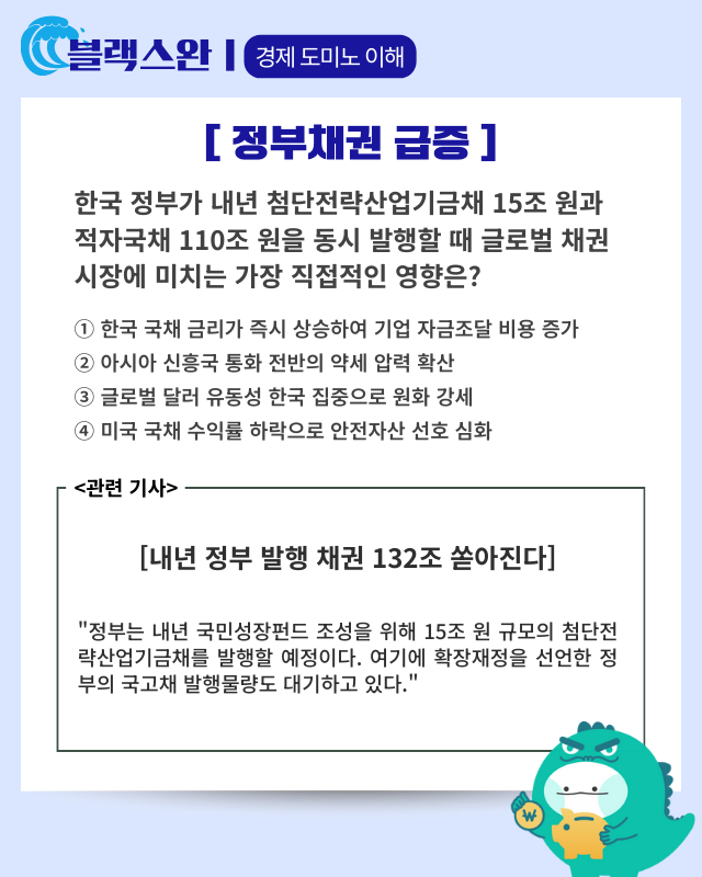 - 핵심 요약: 내년 정부가 직접 발행하거나 보증하는 채권의 규모가 132조 원을 넘어설 것으로 집계됐다. 정부는 내년 국민성장펀드 조성을 위해 15조 원 규모의 첨단전략산업기금채를 발행할 예정이며, 이를 포함한 보증채무 잔액은 39조 원으로 올해보다 22조 3000억 원 늘어난다. 여기에 확장재정을 선언한 정부의 적자국채 발행물량 110조 원이 대기하고 있어 정부와 보증채를 합치면 그 규모가 132조 원을 넘어서게 된다. 문제는 미국과 3500억 달러(약 488조 원) 규모의 투자펀드 협상을 벌이고 있다는 점으로, 이 자금 중 10%라도 현금성 투자로 결정나면 정부는 단기간에 48조 원 가량을 국채로 찍어내야 하는 부담을 안게 되는 상황이다. 김정식 연세대 명예교수는 “글로벌 기준금리 인하에도 채권 공급이 자꾸 늘어 장기 채권 금리를 밀어올리는 효과가 나타날 수 있다”며 “정부 부채에 철저한 관리가 요구된다”고 지적했다.