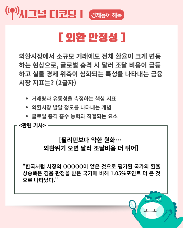 ■ 원화 취약성: 한국은행 분석에 따르면 글로벌 금융위기와 같은 대외 충격 상황에서 한국의 리스크 반응계수가 2.11%포인트로 태국이나 필리핀보다도 높게 나타났다. 이에 따라 외환시장 심도가 얕아 소규모 거래에도 환율이 크게 출렁이는 구조적 취약성이 확인됐다.