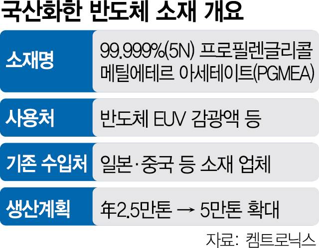 켐트로닉스는 2022년 친환경·초고순도 PGMEA를 자체 개발해 국산화 후 약 600억 원을 투자해 5N PGMEA의 양산 체제를 구축했다.