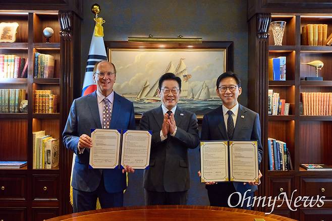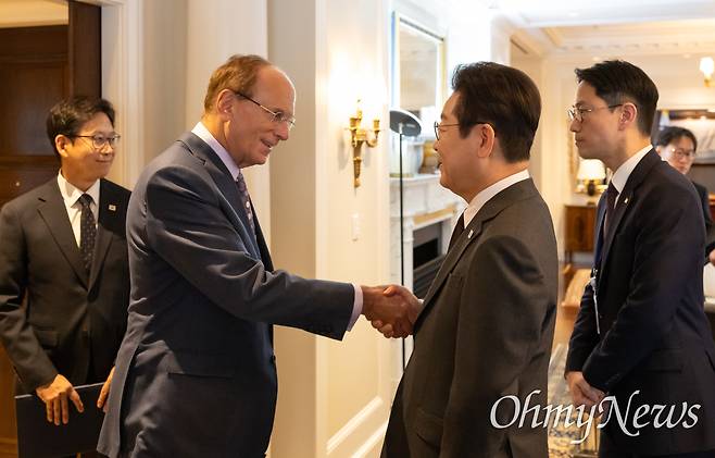 유엔총회 참석차 미국 뉴욕을 방문 중인 이재명 대통령이 22일(현지시간) 첫 일정으로 세계 최대 자산운용사 '블랙록'의 최고경영자(CEO) 래리 핑크 세계경제포럼 의장을 만났다.