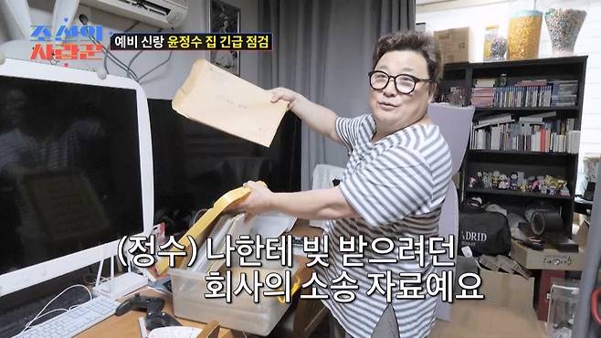 오는 11월 원진서와의 결혼을 앞두고 집을 공개한 ‘53세 예비 신랑’ 윤정수. 그의 집에서는 무려 25년 전 팬들이 준 종이학 등 각종 애장품과 잡동사니가 포착됐다. 심지어 방 한가운데에서 에어컨 실외기까지 튀어나왔다. 또 채권·채무증서와 각종 파산 서류가 빼곡한 박스도 공개됐다.