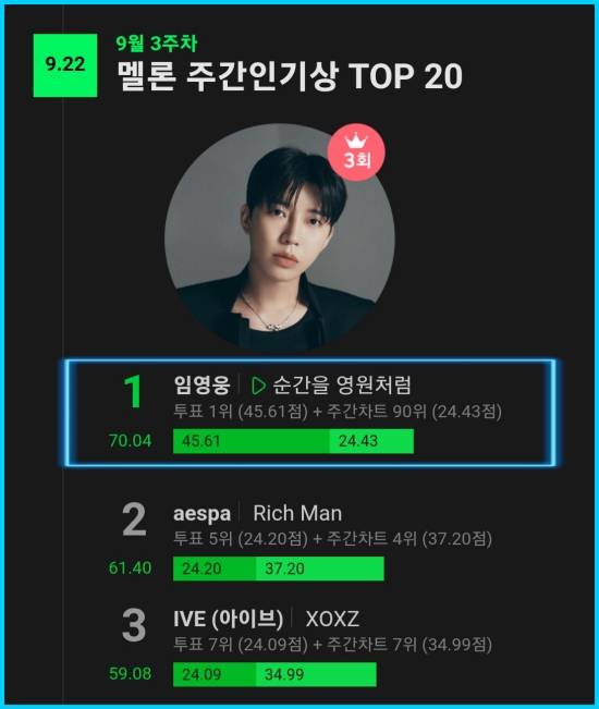 임영웅이 9월 3주 차 멜론 주간 인기상 1위에 올랐다.