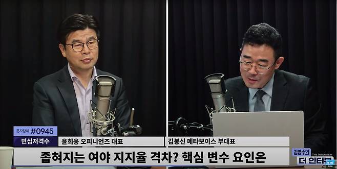 ◇ 김영수 : YTN 라디오 김영수의 더 인터뷰 4부 순서 이어가겠습니다. 민심을 읽고 여론을 분석하는 시간입니다. 민심 저격수 윤희웅 오피니언즈 대표, 김봉신 메타 보이스 부대표 나오셨습니다. 어서 오십시오.