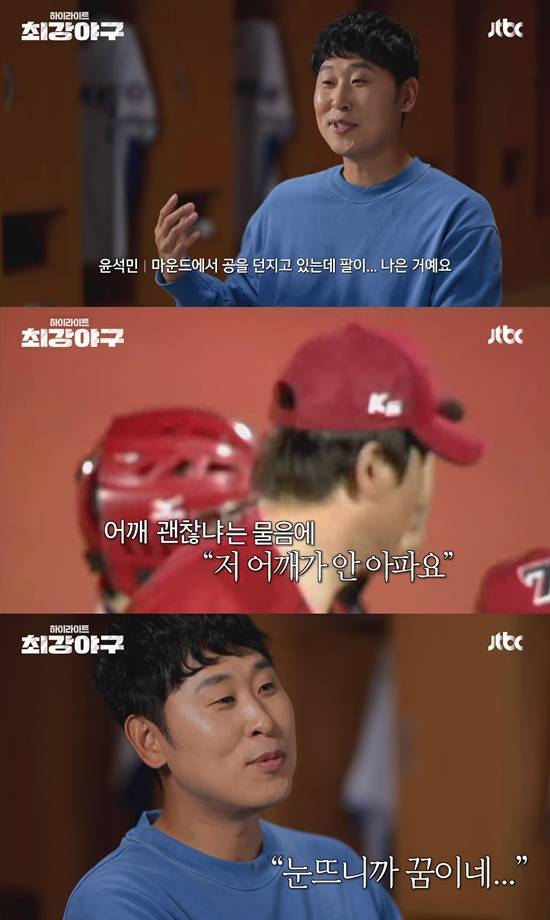 윤석민은 "은퇴하고 되게 자주 꾸는 꿈 중 하나가 마운드에서 공을 던지고 있는데 팔이 나은 거다. 던지는데 안 아프고, 막 너무 신이 나더라. 원하는 대로 공 뿌리고, 150km/h 던지고 그랬다. 어깨 괜찮냐는 물음에 ‘저 어깨가 안 아파요’라고 대답도 했다. 함성 소리도 있고, 막 엄청 행복한 마음으로 승리를 따내고 가는데... 눈 뜨니까 꿈이더라. 그날 기분은 기분이 썩 좋지 않다. 꿈은 좋은데, 그게 현실이 아니라는 게 가장 괴롭더라"라고 전하며 보는 이들을 안타깝게 만들었다.