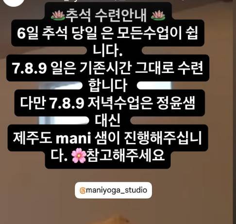 또한 22일 "추석 관련 안내"라는 글과 함께 "6일 추석 당일은 모든 수업이 쉽니다. 7. 8. 9일은 기존 시간 그대로 수련합니다. 다만 7.8.9 저녁 수업은 정윤샘 대신 제주도 mani샘이 진행해 주십니다. 참고해 주세요"라는 글을 덧붙이며 추석에도 당일 빼고 요가원을 연다고 설명했다.