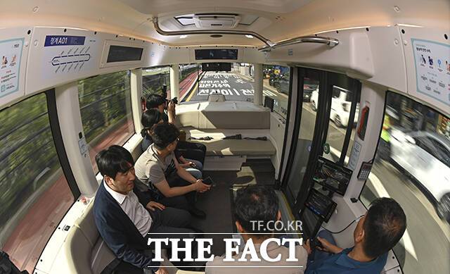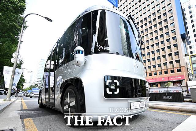 [더팩트ㅣ서예원 기자] 운전석 없는 자율주행셔틀 '청계A01'이 23일 오전 서울 종로구 청계천 일대에서 시험운행을 위해 대기하고 있다.